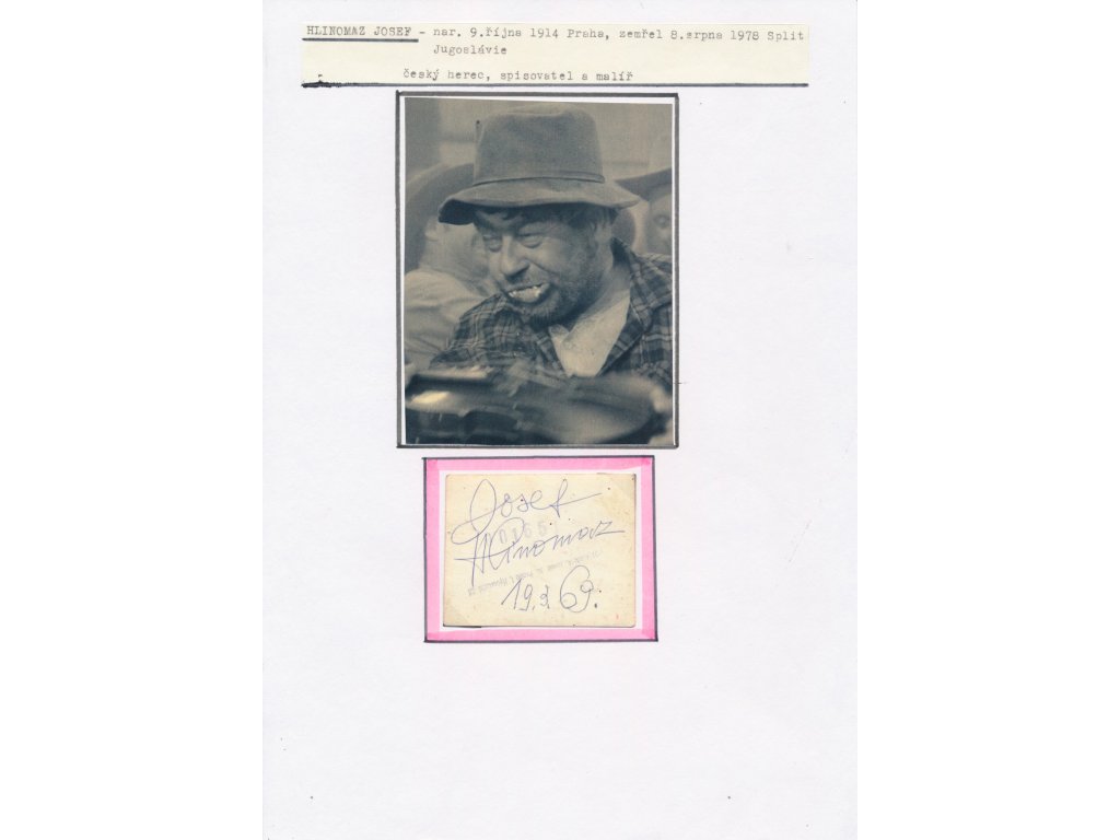 Hlinomaz Josef (1914-1978), český herec, ilustrátor, sběratelský list o velikosti A4 s novinovým výstřižkem a vlastnoručním podpisem, datováno 1969...viz autentické foto