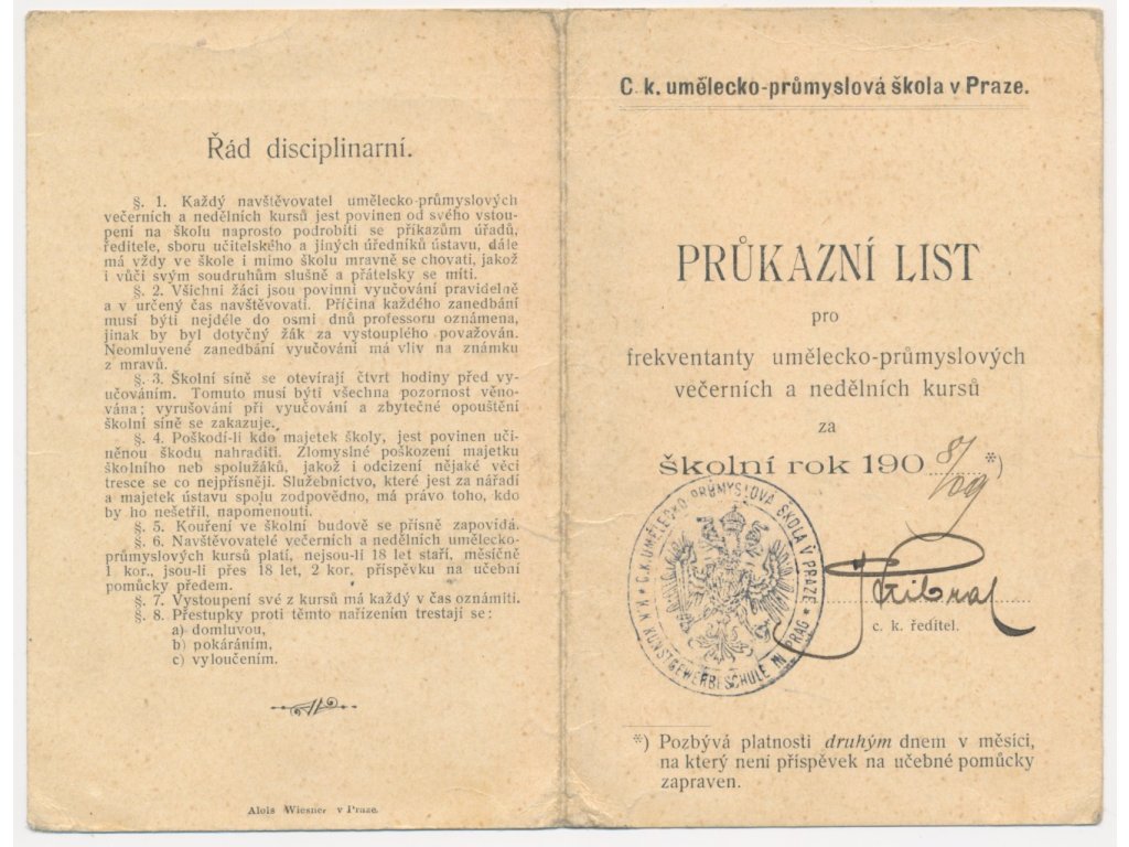 Hofbauer Arnošt (1869-1944), malíř a grafik, sběratelský list o velikosti A4 s Průkazním listem pro frekventanty umělecko-průmyslových večerních a nedělních kurzů, vlastnoruční podpis, datováno 1. března 1909...viz autentické foto