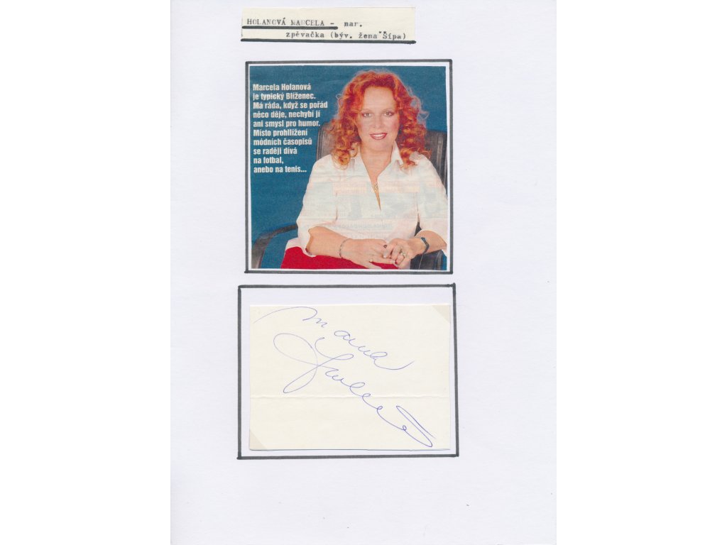 Holanová Marcela (1951), česká zpěvačka, sběratelský list o velikosti A4 s výstřižkem fotografie z časopisu a sběratelskou kartou s vlastnoručním podpisem...viz autentické foto