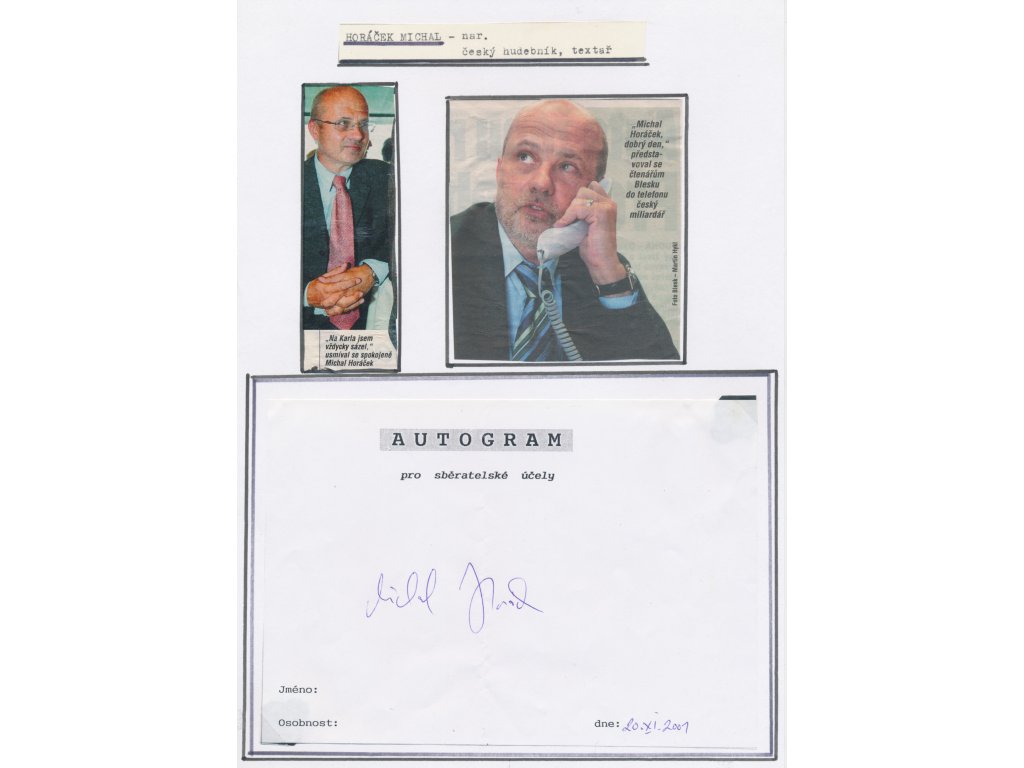 Horáček Michal (1952), český producent, textař, esejista, sběratelský list o velikosti A4 se sběratelskou kartou s vlastnoručním podpisem (datováno 2001) a s výstřižky fotografií z časopisu...viz autentické foto
