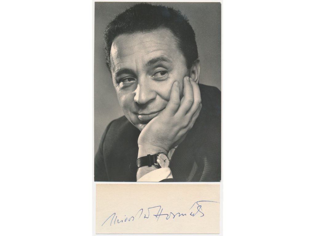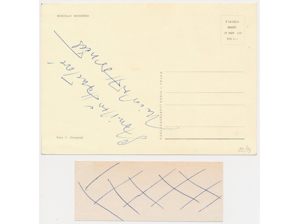 Horníček Miloslav (1918-2003), český herec, spisovatel, dramatik, portrétová pohlednice o rozměrech cca 12x17cm s vlastnoručním podpisem a sběratelská kartička s vlastnoručním podpisem...viz autentické foto