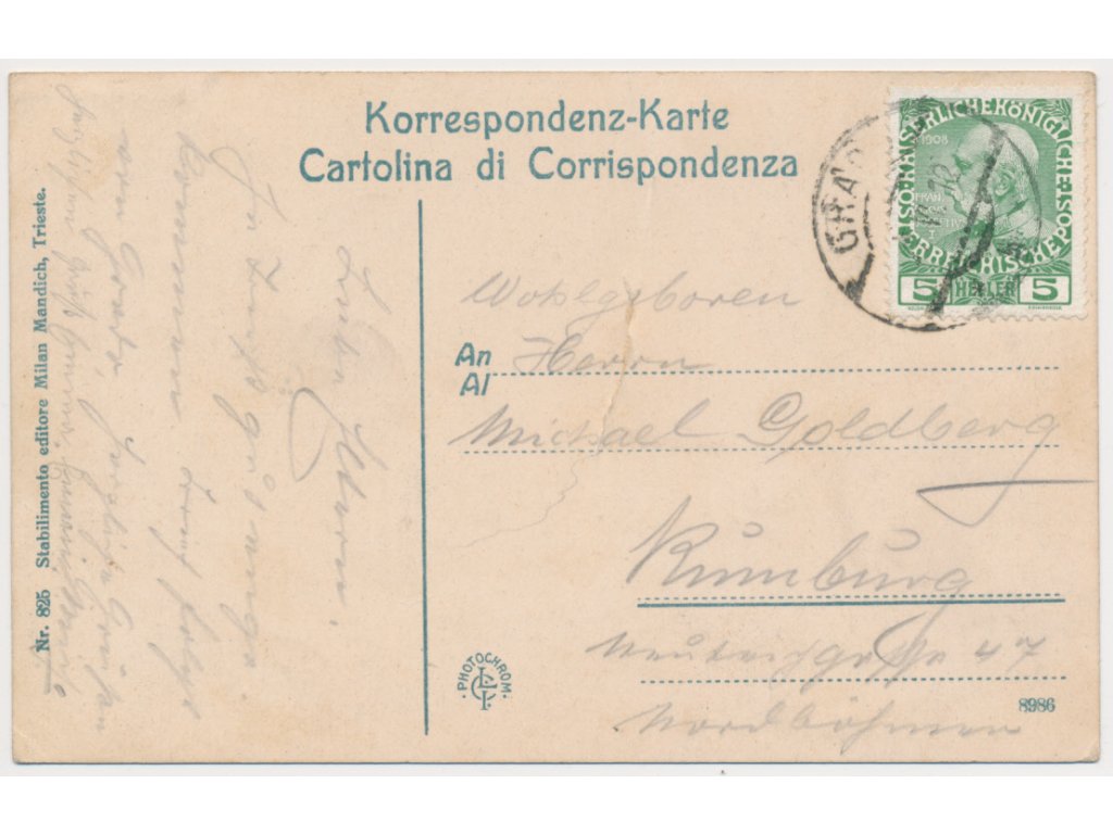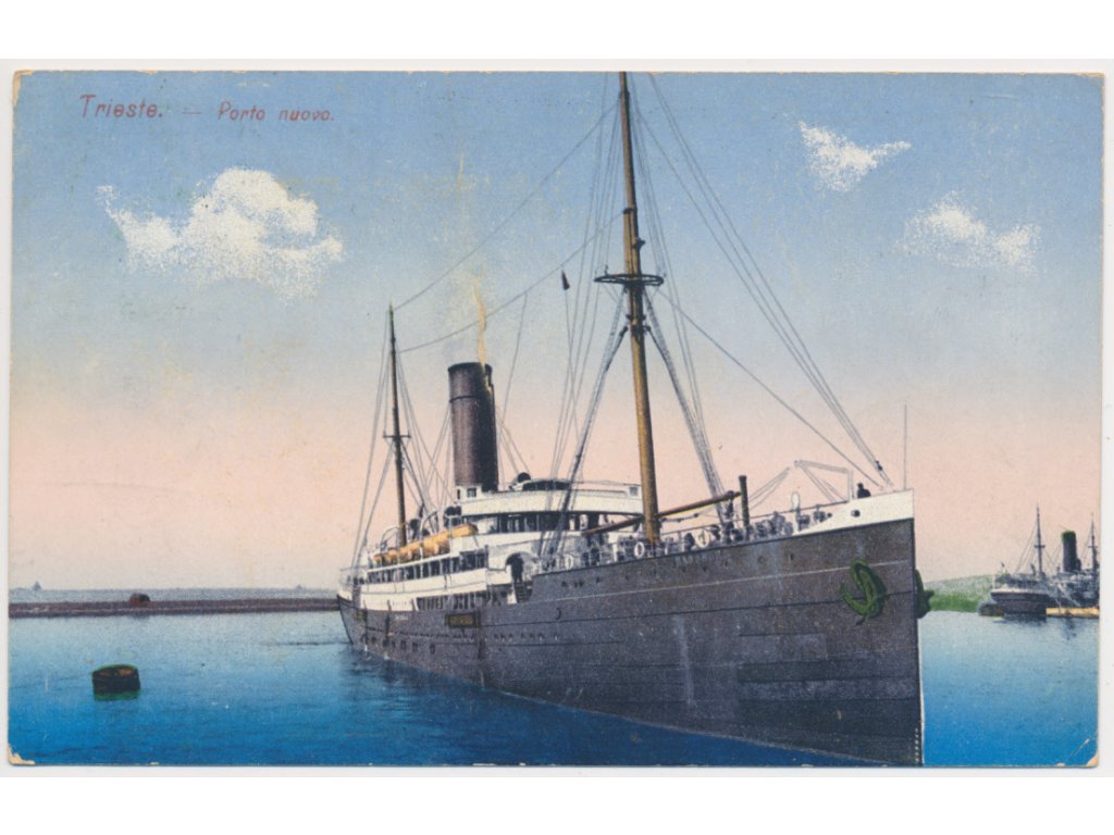 Itálie, Trieste, Porto nouvo, celkový pohled na parník, 1912, vada - lom
