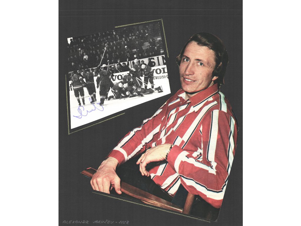 Jakušev Alexandr Sergejevič (1947), ruský hokejista, od roku 2003 je členem Síně slávy Mezinárodní hokejové federace, sběratelský list o velikosti cca 36x27 cm, vlastnoruční podpis