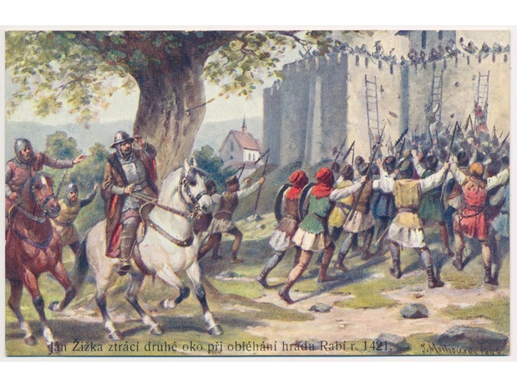 Jan Žižka ztrácí druhé oko při obléhání hradu Rabí r. 1421, cca 1930