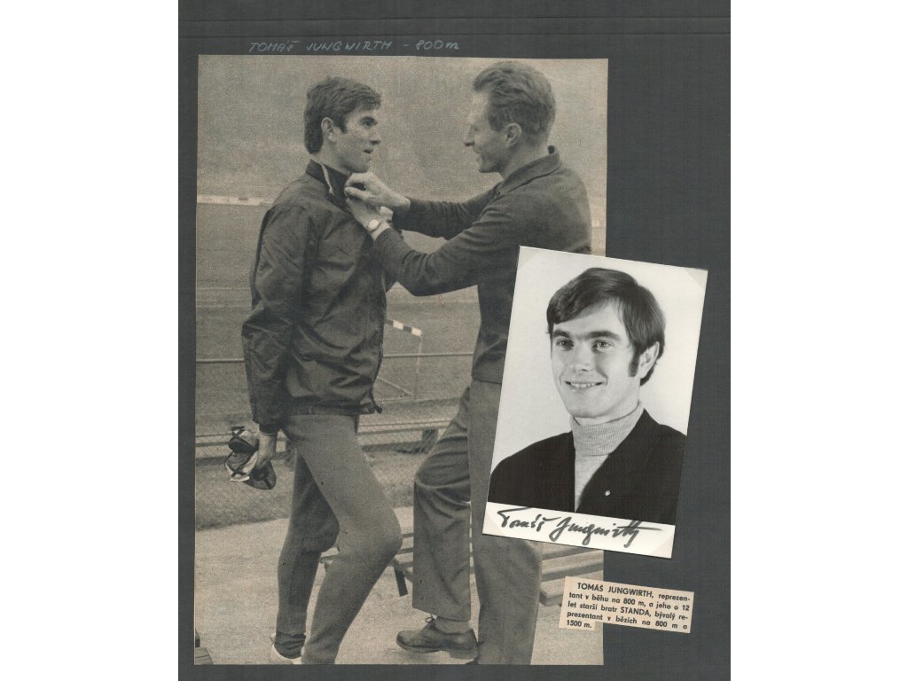 Jungwirth Tomáš (1942-1998), český atlet a novinář, sběratelský list o velikosti cca 36x27 cm s novinovým výstřižkem, portrétovou fotografií a vlastnoručním podpisem