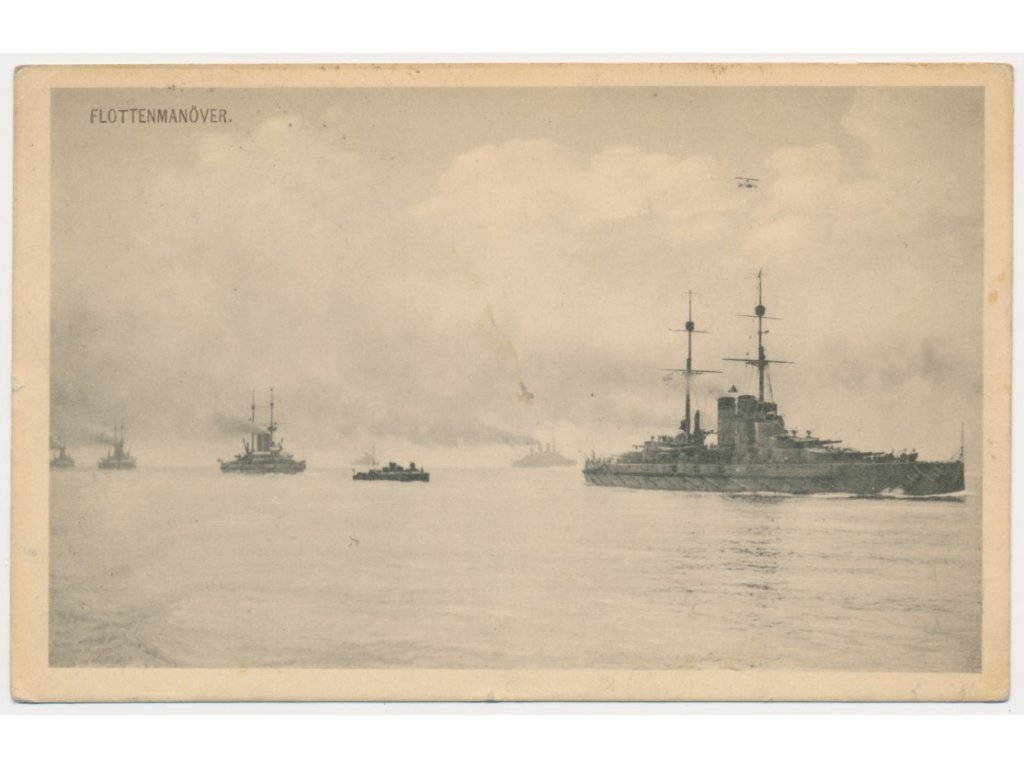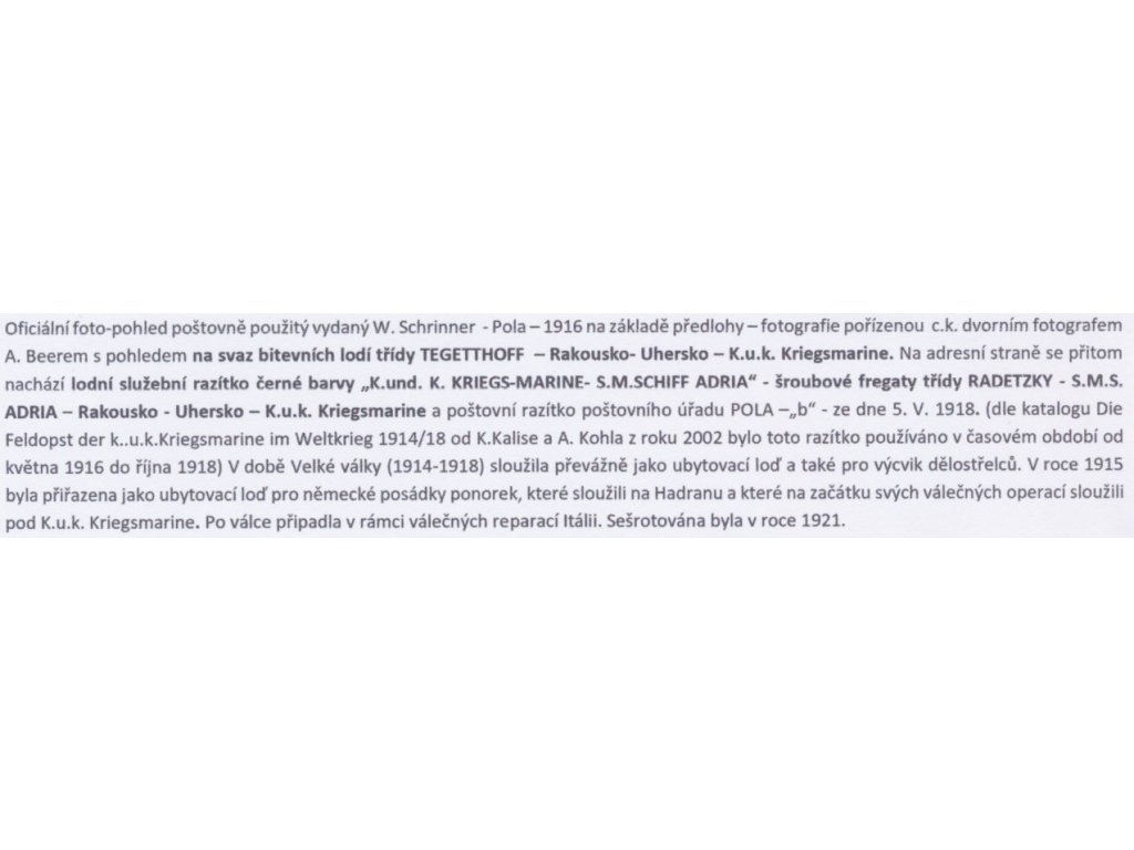 K.U.K. Kriegsmarine, poštovně použitá pohlednice s pohledem na svaz lodí třídy Tegetthoff, 1916, denní +lodní razítko, stav 1/1, přiložen štítek s podrobným sběratelským popisem