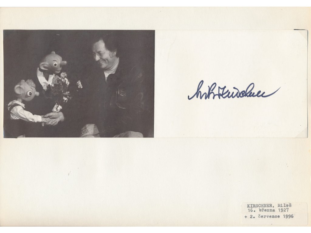 Kirschner Miloš (1927-1996), český loutkář, herec, sběratelský list s vl. podpisem