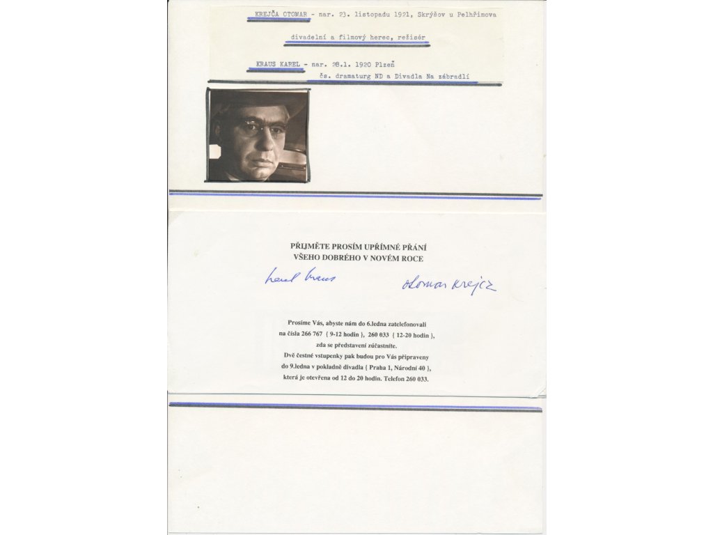 Krejča Otomar, divadelní režisér, herec; Kraus Karel, dramaturg, Sběratelský list s vlastnoručními podpisy režiséra a dramaturga