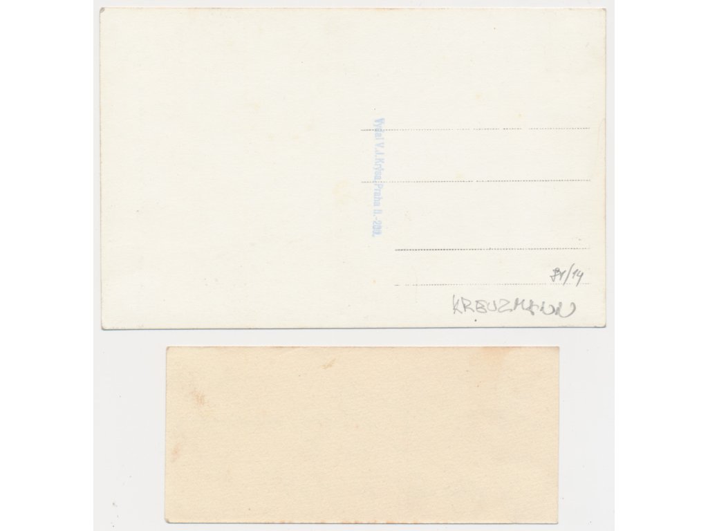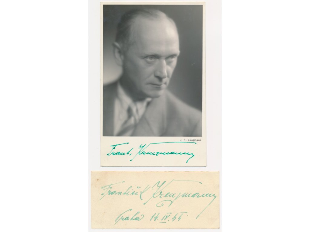 Kreuzmann František st. (1895-1960), český činoherní a filmový herec, operetní zpěvák, portrétová pohlednice (foto J.F.Langhans) o rozměrech cca 9x14cm s vlastnoručním podpisem a sběratelská kartička s vlastnoručním podpisem (datováno 1944)...viz autentické foto