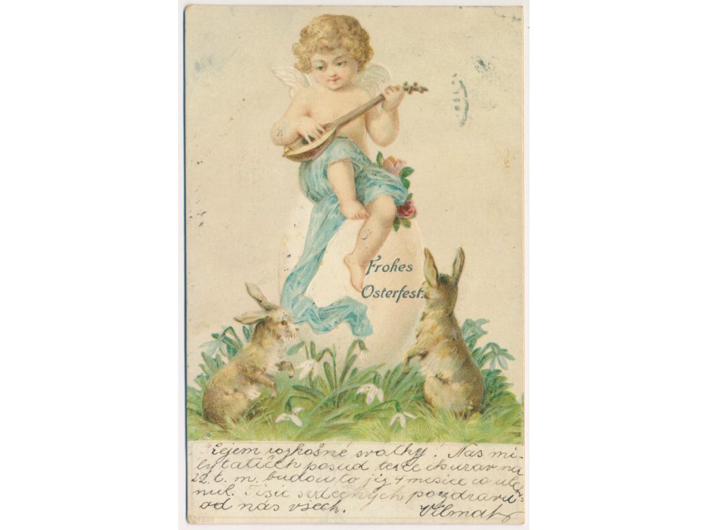 Litografické přání andílka sedícího na velikonočním vejci, cca 1900