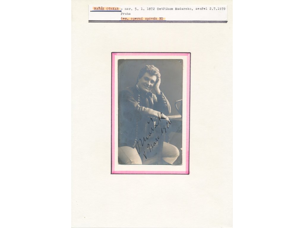 Mařák Otakar (1872-1939), český operní pěvec (tenor), sběratelský list o velikosti A4 s portrétovou pohlednicí a vlastnoručním podpisem, datováno 1916...viz autentické foto