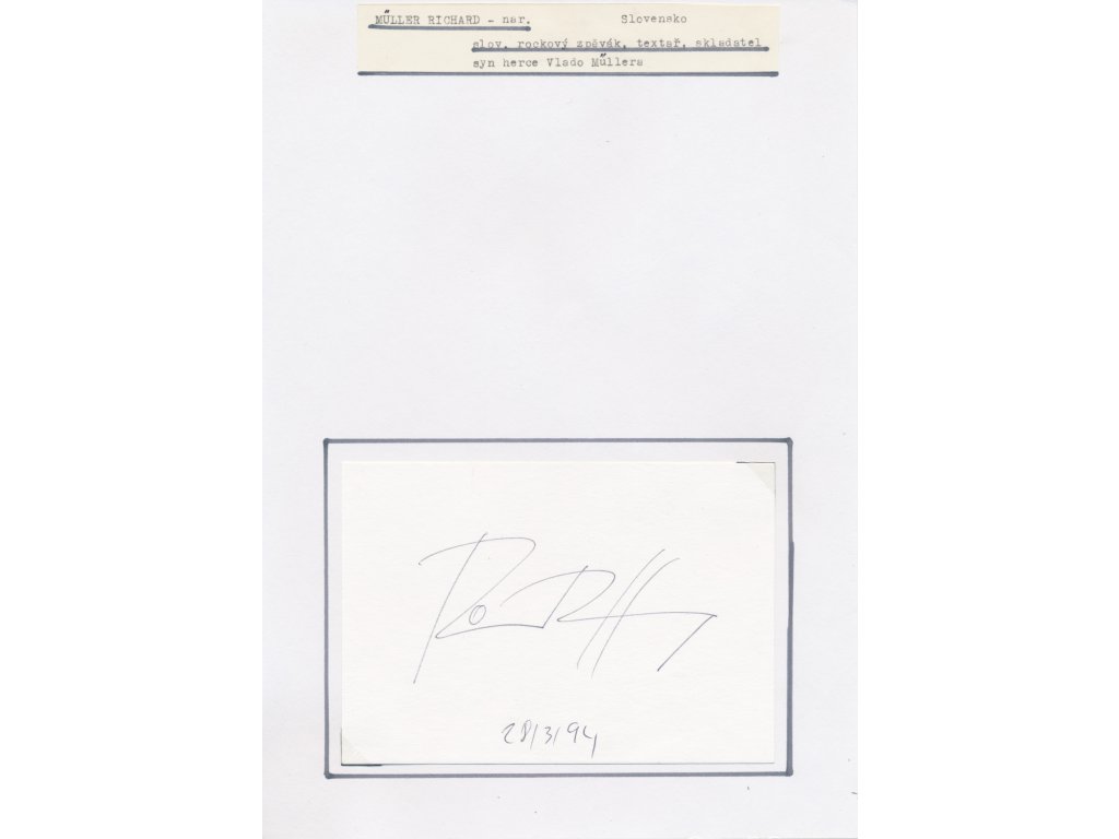 Müller Richard (1961), slovenský zpěvák a hudebník, sběratelský list o velikosti A4 se sběratelskou kartou s vlastnoručním podpisem (datováno 1994)...viz autentické foto
