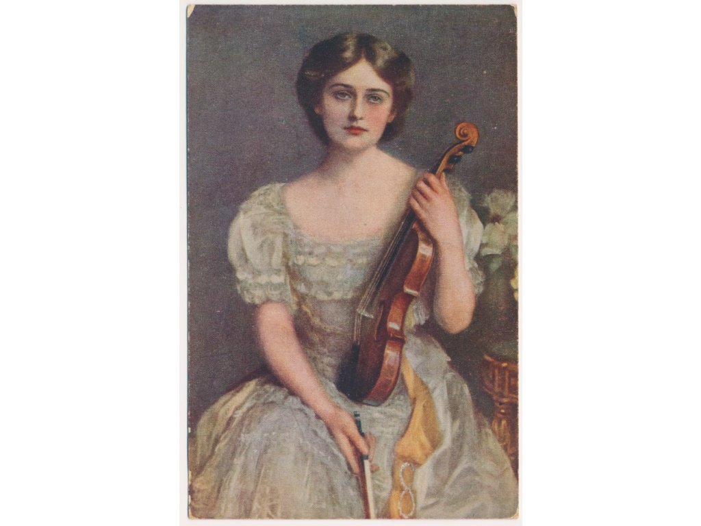 Námětová pohlednice, Dívka s houslemi, cca 1920
