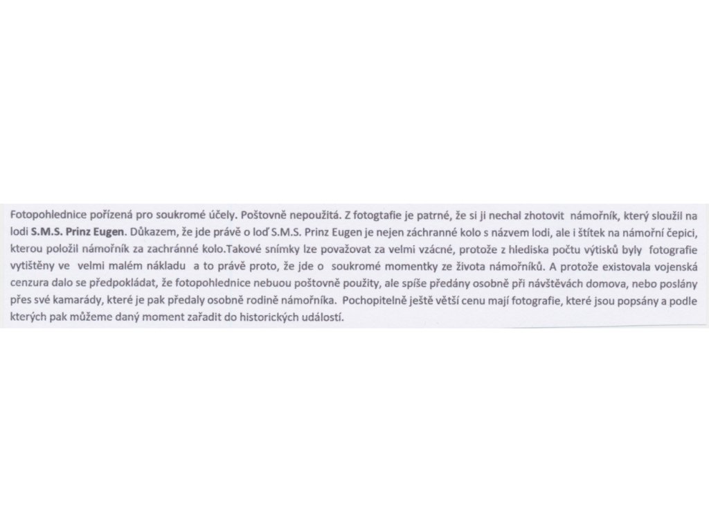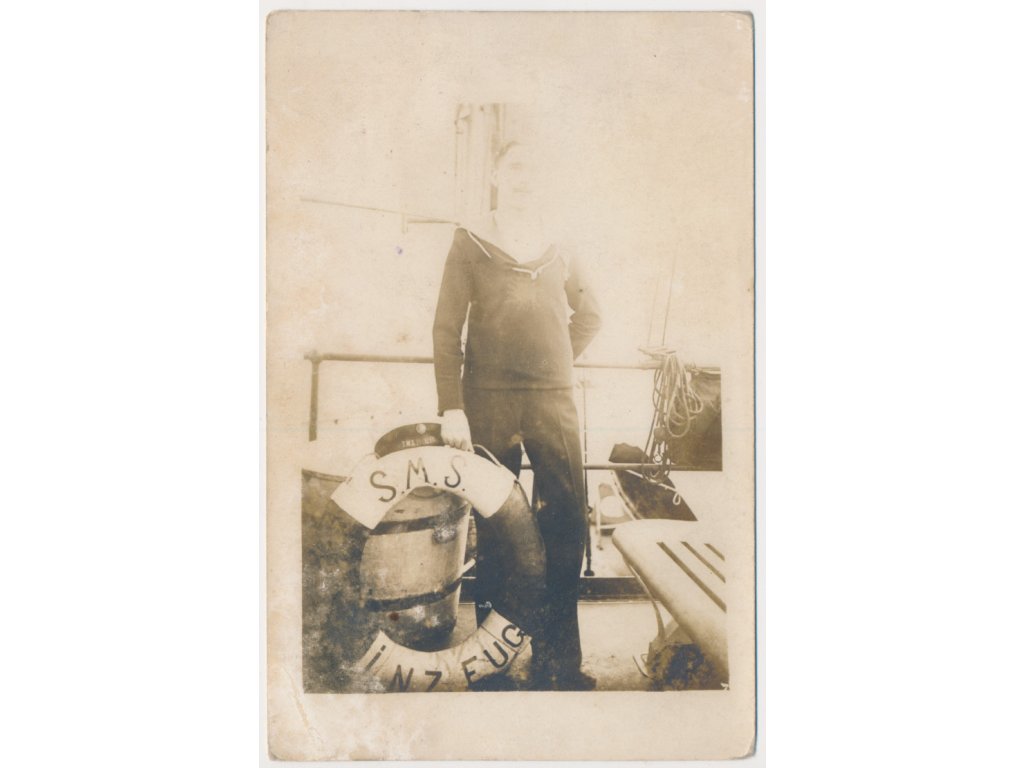 Námořník se záchranným kruhem z lodi S. M. S. Prinz Eugeni, cca 1917, přiložen štítek s podrobným sběratelským popisem, pohlednice neprošlá poštou, stav odpovídá použití, uložení a stáří...viz autentické foto