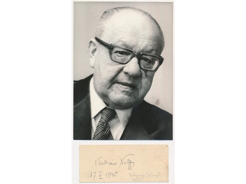 Neff Vladimír (1909-1983), český spisovatel, překladatel, scénárista, portrétová oficiální fotografie ČTK o rozměrech cca 13x18cm a sběratelská kartička s vlastnoručním podpisem (datováno 1945)...viz autentické foto