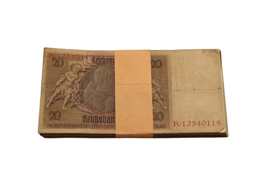 Německo, 20 RM 1929/1939, stokusový balíček přebalený originální páskou ČNB, pokladny devisového odboru, vše staženo z oběhu, datováno 19.XI.1948, vše staženo z oběhu, pěkné původní stavy...viz autentické foto