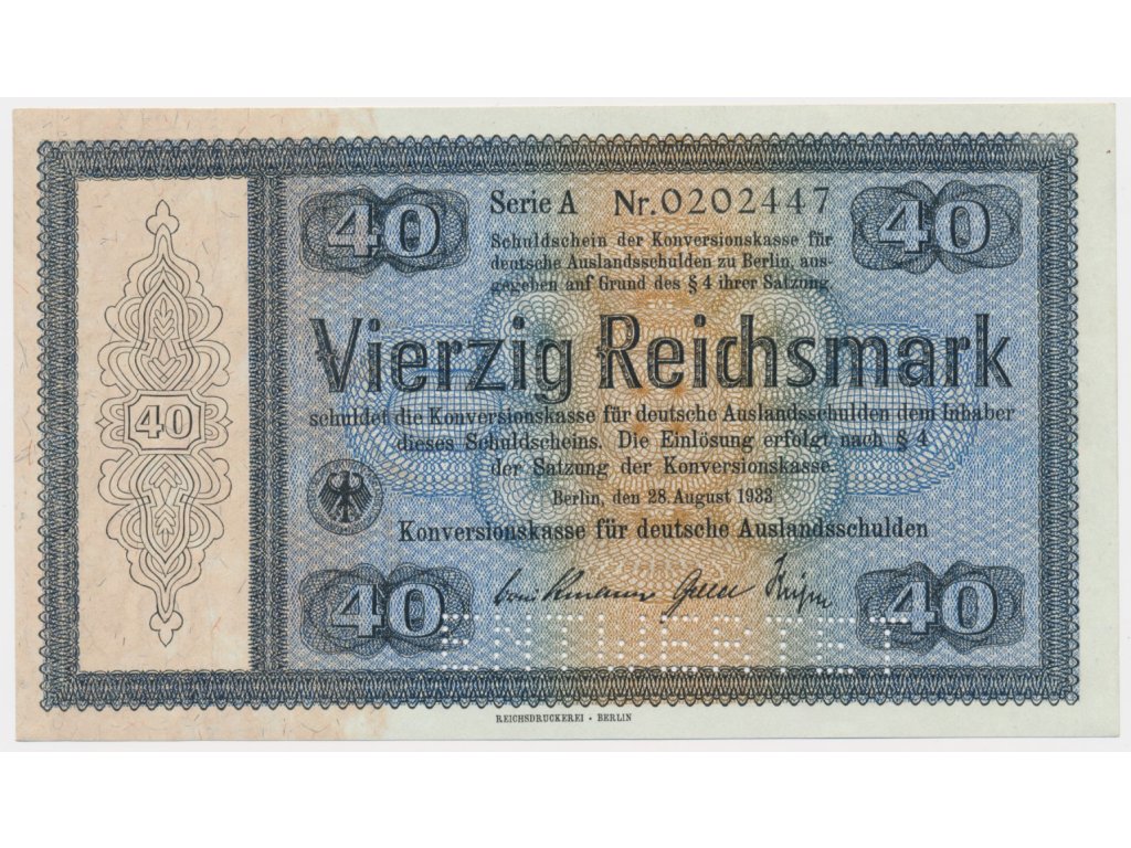 Německo, 40 RM, 1933, Konversionskassenschein, perforace ENTWERTET, krásný stav 0++...viz autentické foto