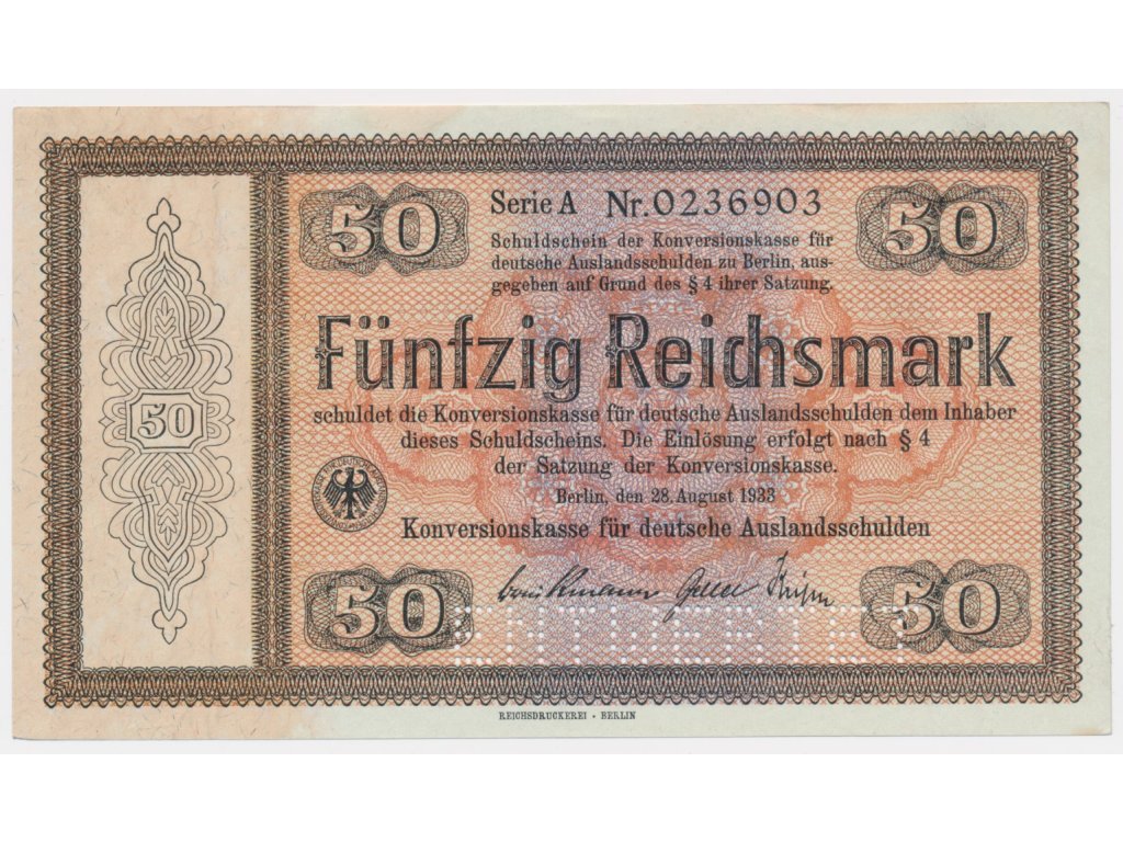 Německo, 50 RM, 1933, Konversionskassenschein, perforace ENTWERTET, krásný stav 0++