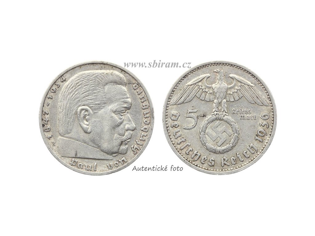Německo, Ag (stříbrná) mince 5 RM, 1936 E, Hindenburg...viz autentické foto