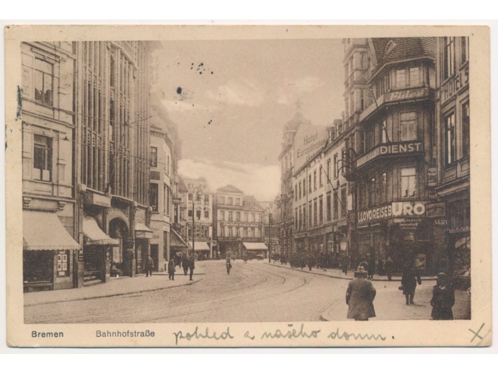 Německo, Bremen (Brémy), Bahnhofstrasse, oživená ulice, cca 1928