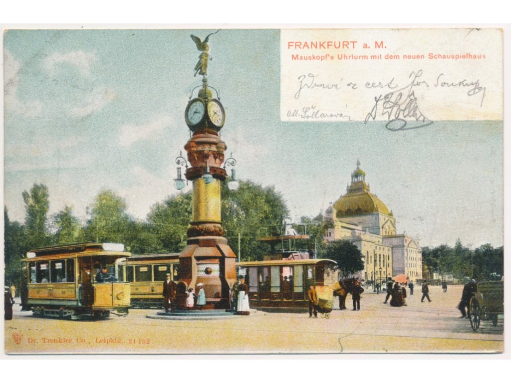 Německo, Frankfurt nad Mohanem, Mauskopf's Uhrturm mit dem neuen Schauspielhaus, 1905