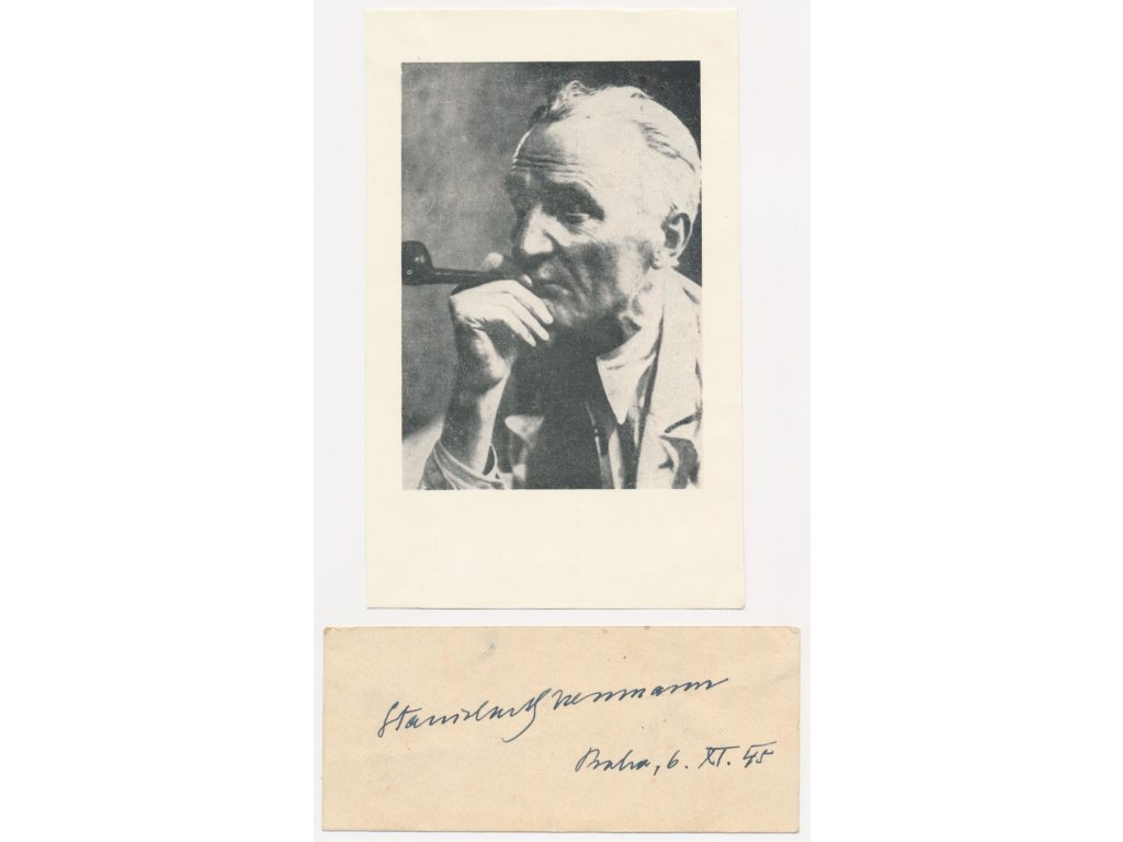 Neumann Stanislav Kostka (1875-1947), český básník, novinář, literární a výtvarný kritik, překladatel, výstřižek portrétové fotografie z časopisu o rozměrech cca 9x14cm a sběratelská kartička s vlastnoručním podpisem (datováno 1945)...viz autentické foto