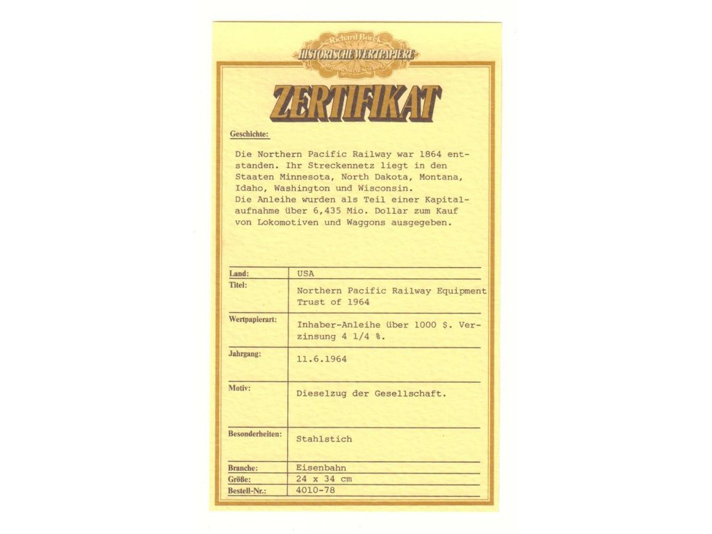 Northern Pacific Railway Equipment trust of 1964, akcie $1000 - železnice, 1964, rozměr 345x235mm, certifikát pravosti firmy Richard Borek přiložen, všechny náležitosti, bezvadná zachovalost UNC