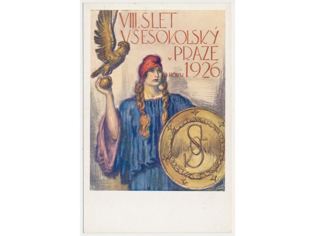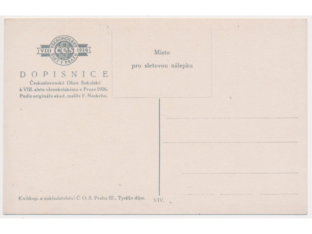 Oficiální dopisnice, VIII. slet všesokolský v Praze 1926, dle orig. ak. malíře F. Naskeho
