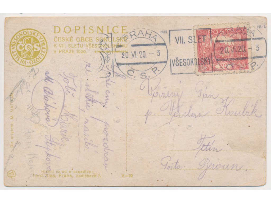 Oficiální pohlednice ČOS k VII. sletu všesokolskému v Praze, 1920
