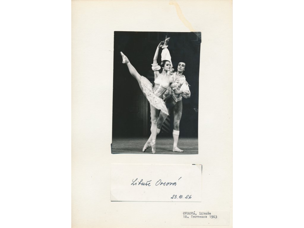 Ovsová Libuše (1963), česká baletka, tanečnice, pedagožka, sběratelský list o velikosti A4 s vlastnoručně podepsanou fotografií o rozměrech cca 11x16cm (datováno 1986) a se sběratelskou kartičkou s vl. podpisem (datováno 1986)...viz autentické foto