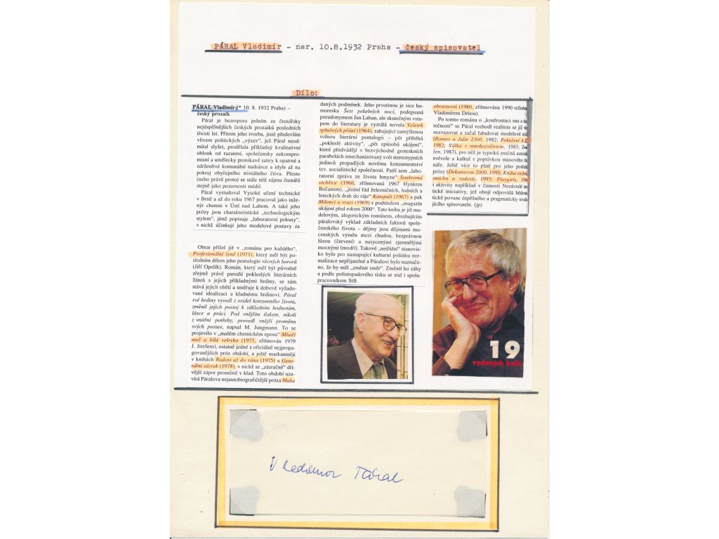 Páral Vladimír (1932), český spisovatel, sběratelský list o velikosti A4 s výstřižky z novin a sběratelskou kartičkou s vlastnoručním podpisem + přihláška na 2. největší autogramiádu na světě...viz autentické foto