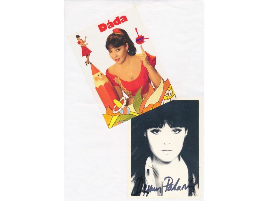 Patrasová Dagmar (1956), česká herečka, zpěvačka, moderátorka, sběratelský list o velikosti A4 s portrétovou fotografií o rozměrech cca 10x15cm s vlastnoručním podpisem a s propagační fotografií "Dáda baby studio"...viz autentické foto