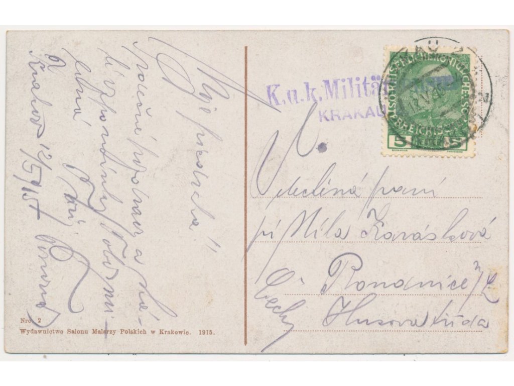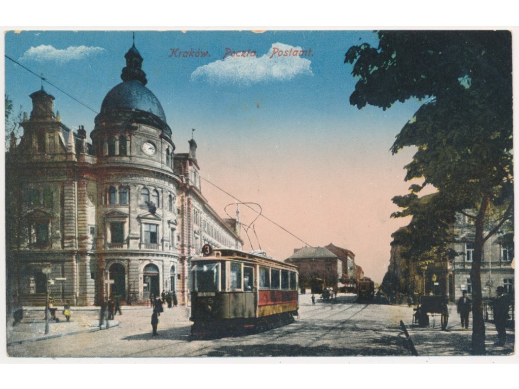 Polsko, Krakov (Kraków), Poczta, oživená ulice s tramvají před poštou, 1915