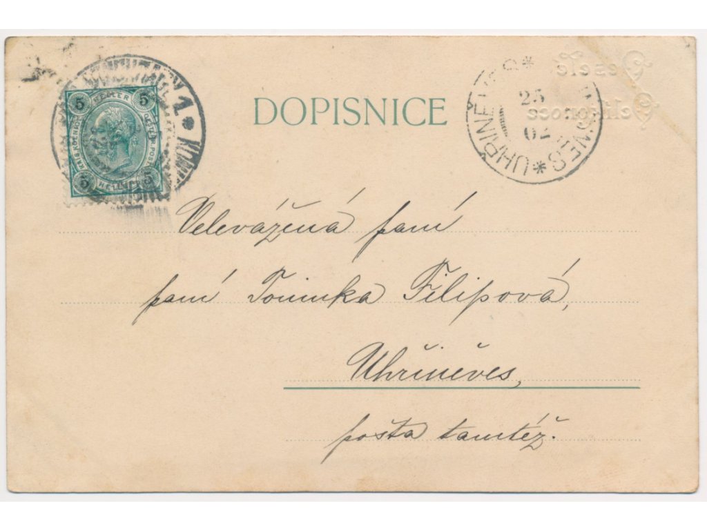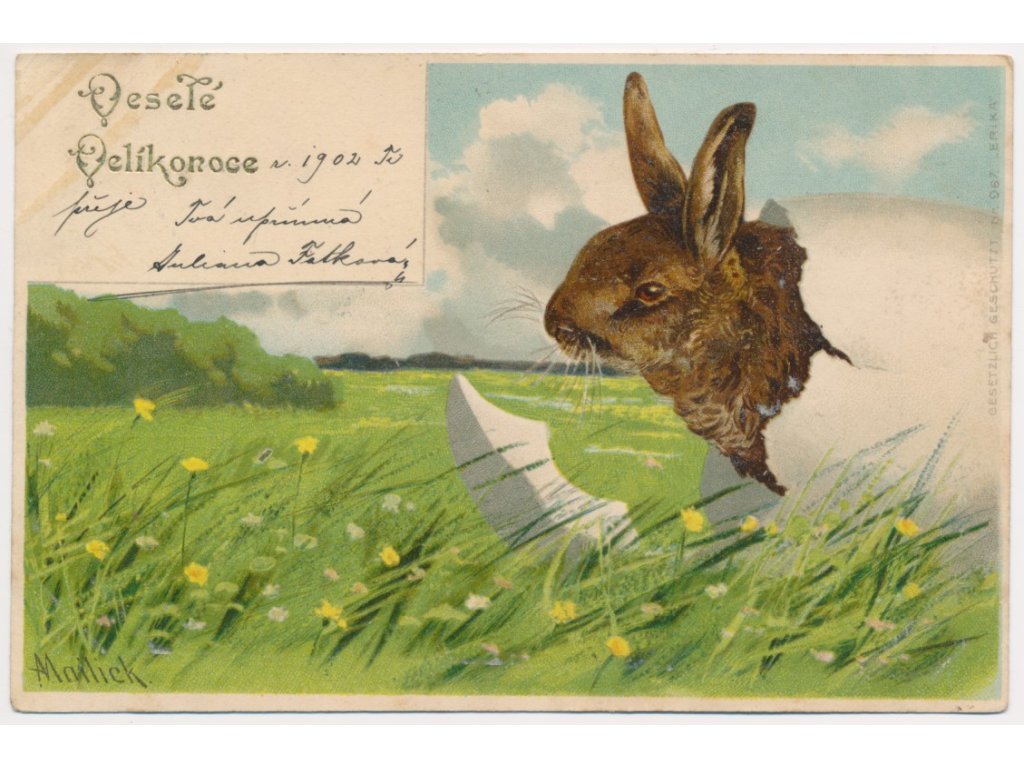 Přání s velikonočním zajíčkem na paloučku, A. Mailick, cca 1902