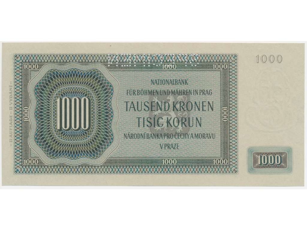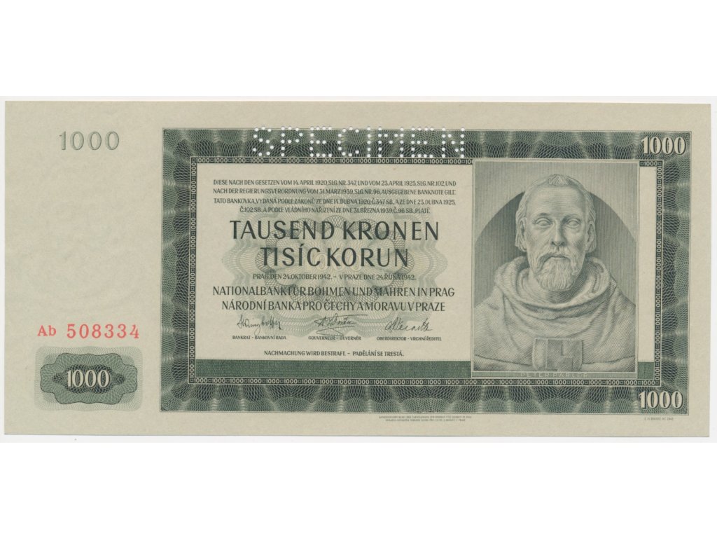 Protektorát, 1000 K, 1942, série Ab, perforace SPECIMEN, stav UNC...viz autentické foto