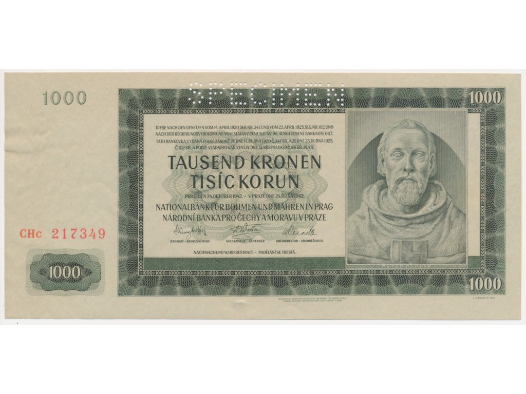 Protektorát, 1000 K, 1942, série CHc, perforace SPECIMEN, stav 0-...viz autentické foto