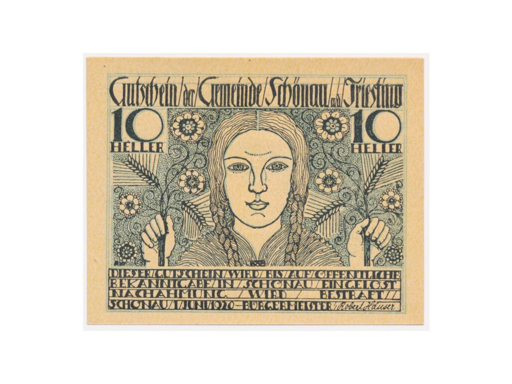 Rakousko, nouzová bankovka 10 h, Schönau an der Triesting, 1920, krásný stav UNC...viz autentické foto