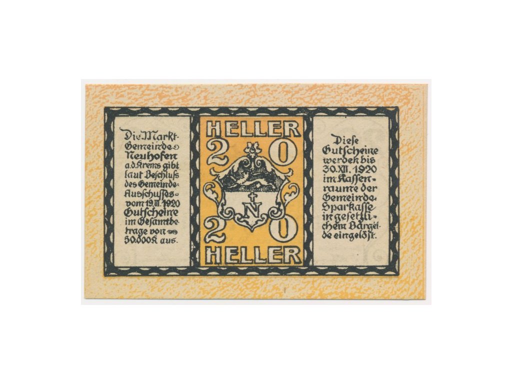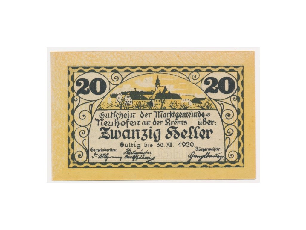 Rakousko, nouzová bankovka 20 h, Neuhofen, 1920, krásný stav UNC...viz autentické foto