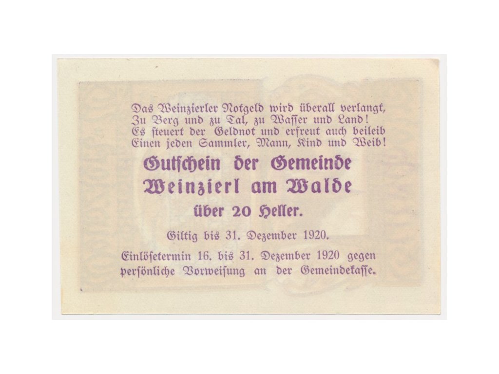 Rakousko, nouzová bankovka 20 h, Weinzierl, 1920, krásný stav UNC...viz autentické foto