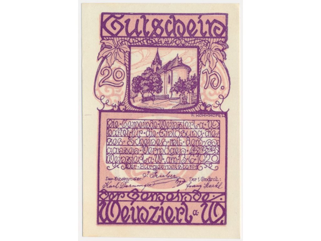 Rakousko, nouzová bankovka 20 h, Weinzierl, 1920, krásný stav UNC