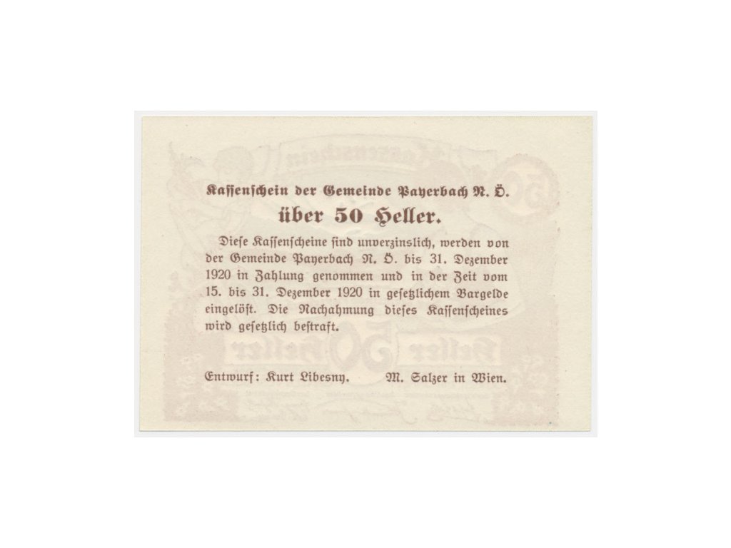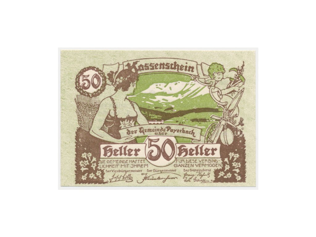 Rakousko, nouzová bankovka 50 h, Payerbach, 1920, krásný stav UNC