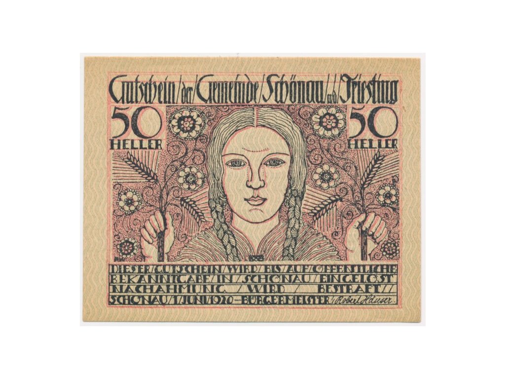Rakousko, nouzová bankovka 50 h, Schönau an der Triesting, 1920, krásný stav UNC...viz autentické foto