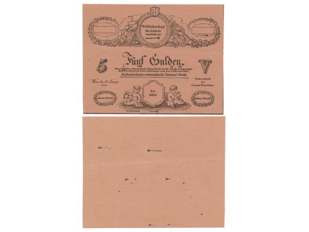Rakousko - Uhersko, 5 Gulden 1841, peněžní formulář na růžovém papíře, černým perem dobově vyznačené markanty k rozlišení od padělků, krásná sběratelská jakost - stav 1 .....viz autentické foto