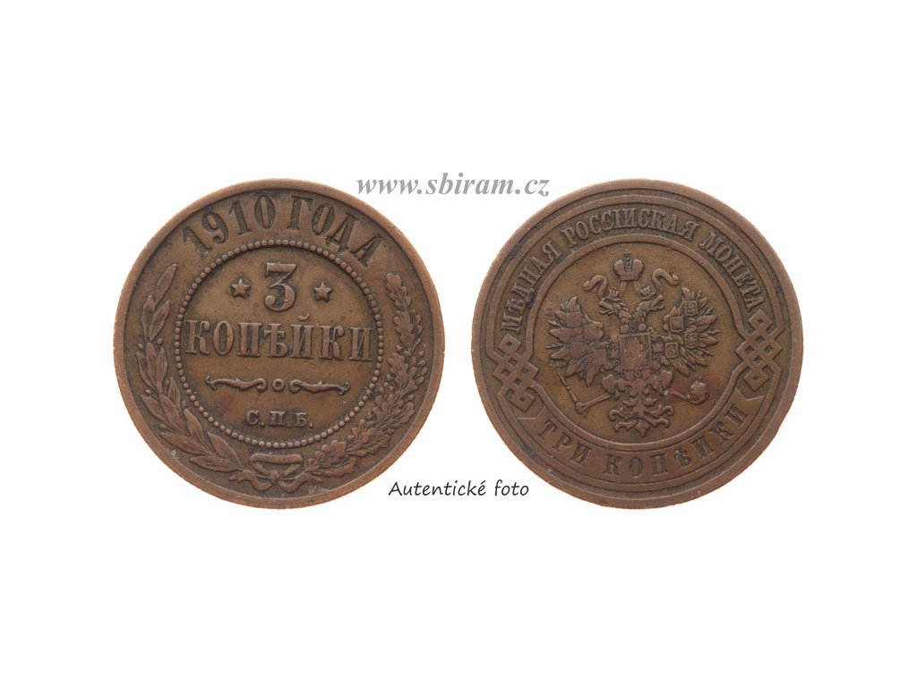 Rusko, Mikuláš II. (1894 - 1917), mince 3 Kopějky, 1910 S.P.B...viz autentické foto