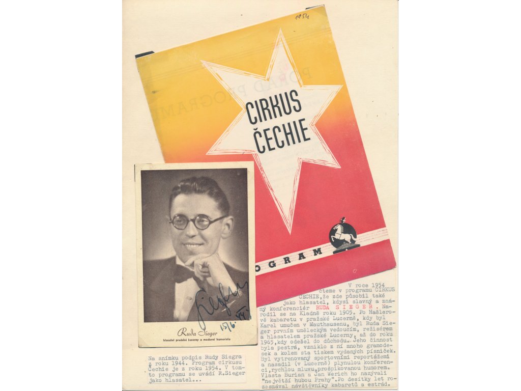 Sieger Ruda (1905-1987), konferenciér, estrádní a kabaretní umělec, sběratelský list o velikosti A4 s portrétovou propagační kartou a vlastnoručním podpisem (datováno 1944) a program Cirkusu Čechie...viz autentické foto