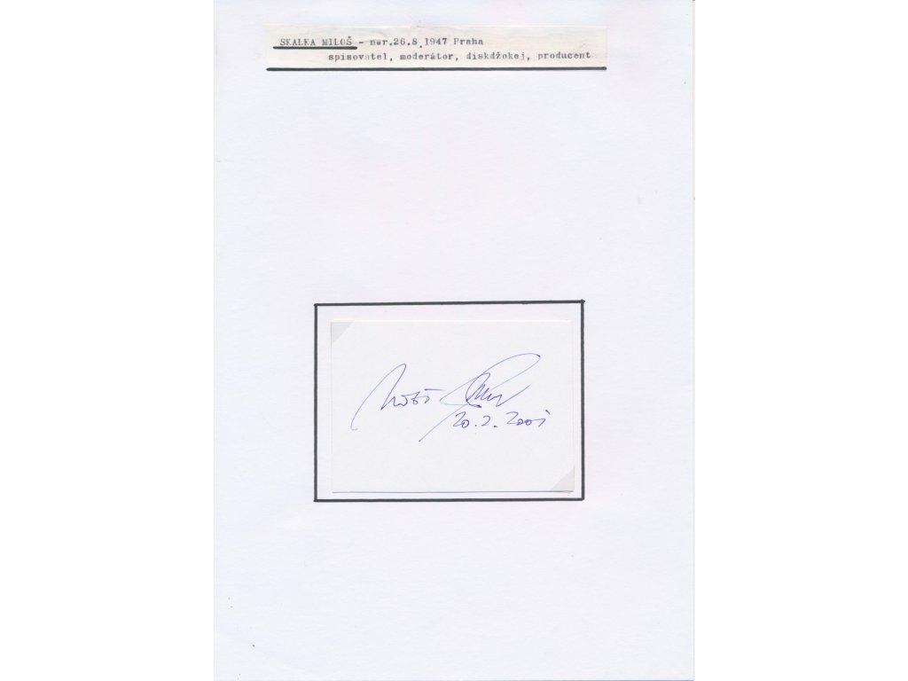 Skalka Miloš (1947), český hudební publicista, textař, diskžokej, moderátor hudebních pořadů, sběratelský list o velikosti A4 se sběratelskou kartičkou a vlastnoručním podpisem, datováno 20.2.2001...viz autentické foto