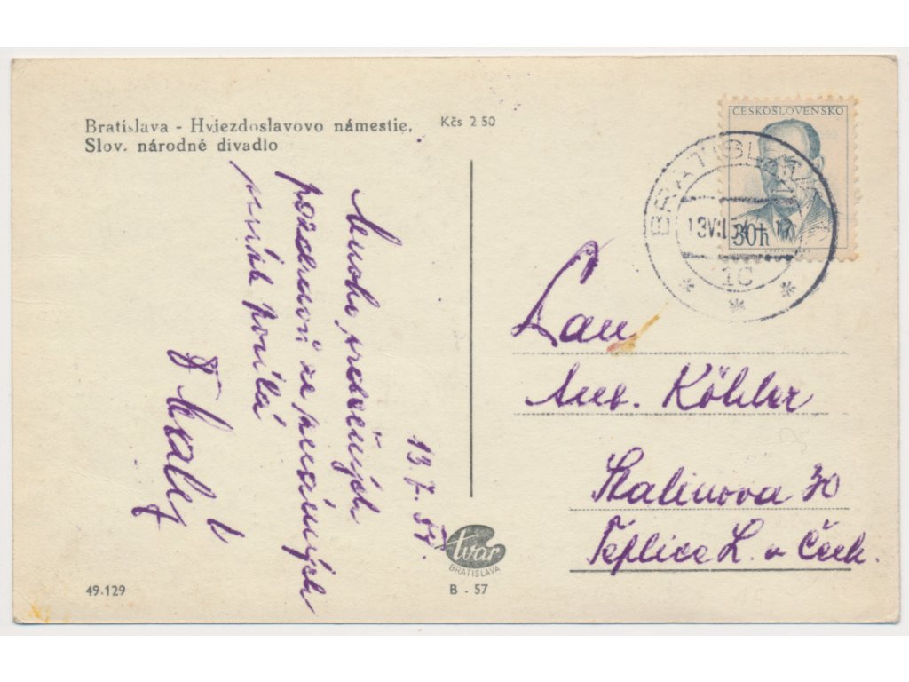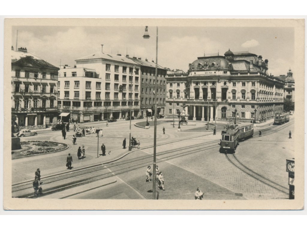 Slovensko, Bratislava, Hviezdoslavovo náměstí, divadlo, lidé, tramvaj..., 1954