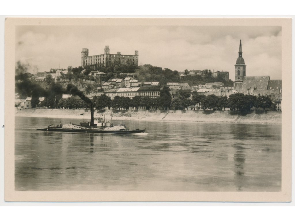 Slovensko, Bratislava, Pohlad na město od řeky s parníkem, cca 1946