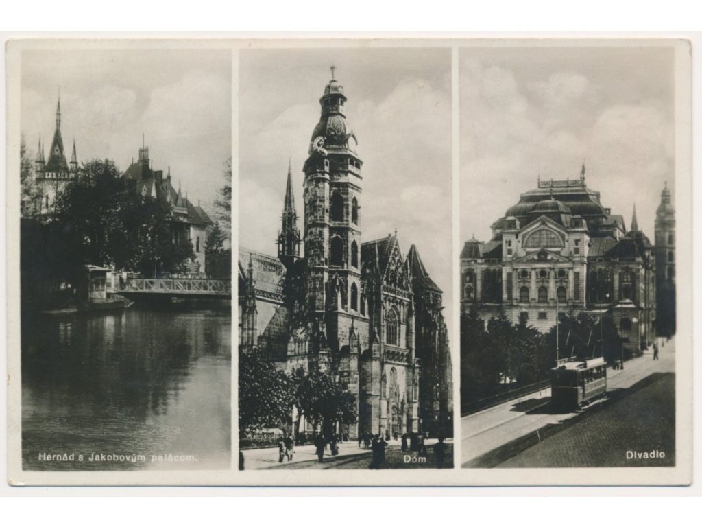 Slovensko, Košice, 3 záběr, Dóm, Divadlo, Hernád s Jakobovým palácom, 1930