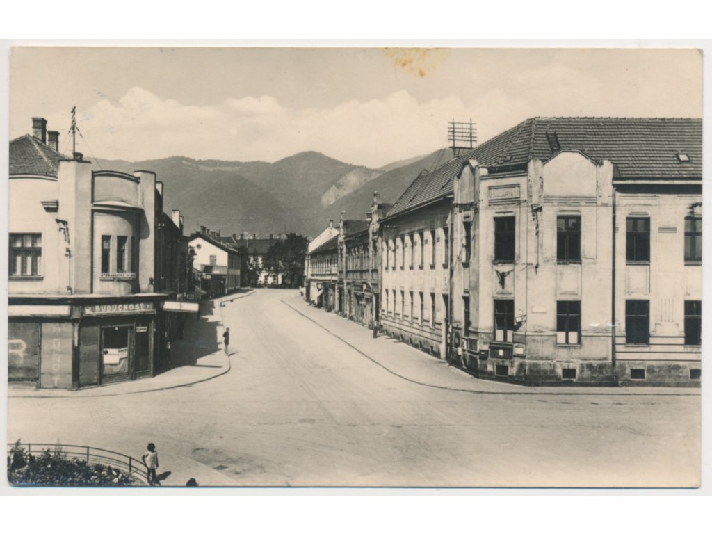 Slovensko, Vrútky, městská partie s domy a obchody, cca 1956